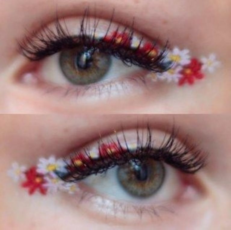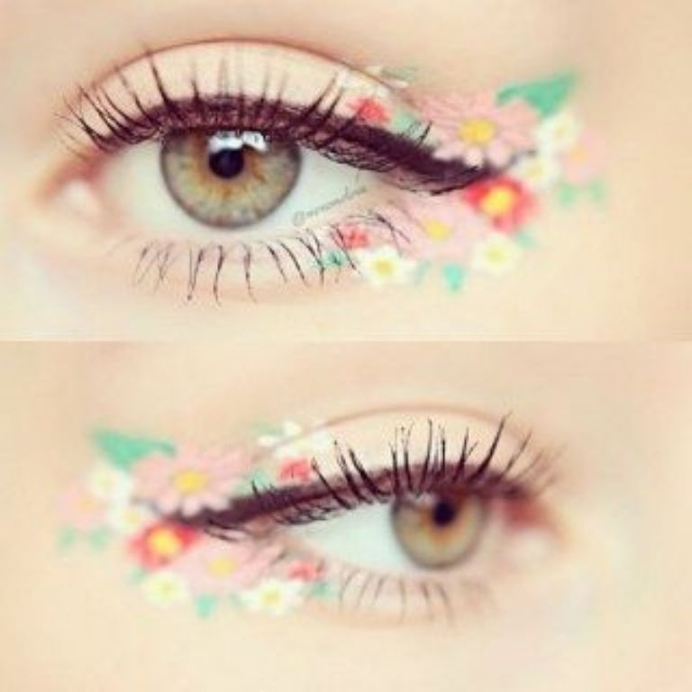 Los diseños dependen totalmente de la imaginación de quien realice el maquillaje, puedes crear algunos con una sola flor pequeña o llenar todo el contorno de tu ojo con varias flores de diferentes colores. También existen los de contraste, aquellos que buscan que el color de las flores sea opuesto al de la sombra que pondrán en sus ojos.