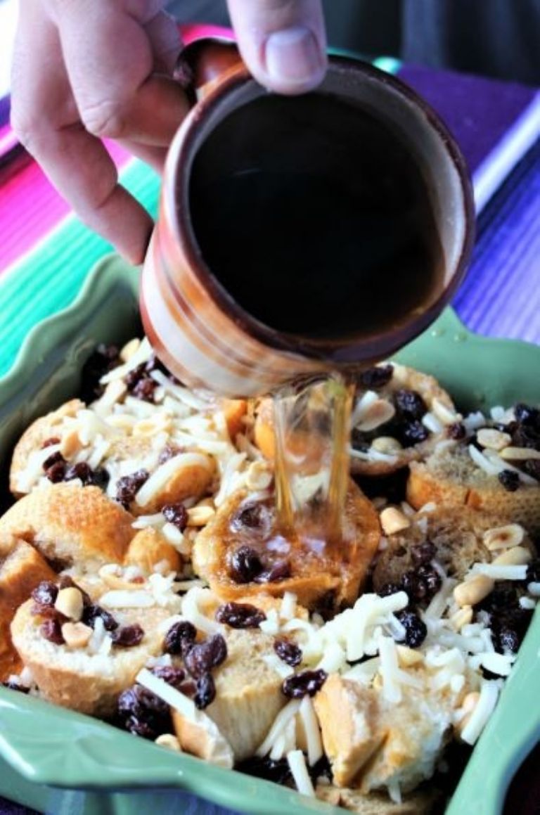 - En un refractario acomoda las rodajas de pan y báñalas con el piloncillo, Agrega los cacahuates, el coco rallado, la nuez, las almendras y el queso.