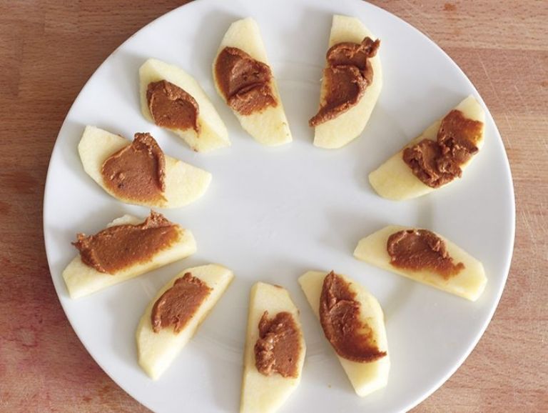 - Toma todas las rodajas de manzana y úntalas con un poco de mantequilla de maní.