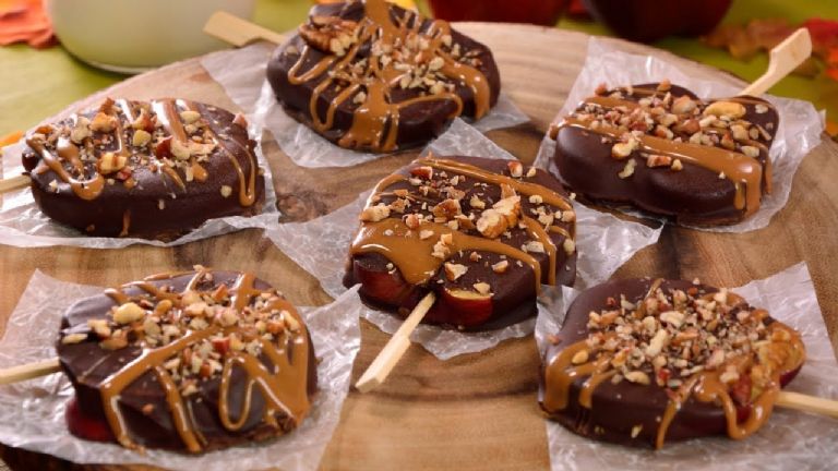 - Cubre dos manzanas con el chocolate amargo y las otras dos con el chocolate blanco. Llévalas a refrigerar durante 20 minutos.