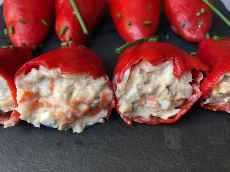 4. Corta la parte superior de los pimientos, retira sus venas y rellena con la mezcla de atún.