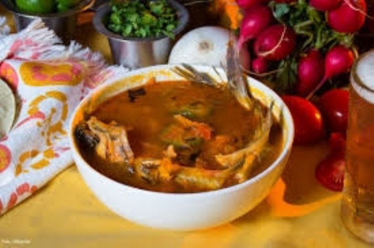 Esta es una sopa de pescado, la cual es cocido en sus propios jugos, con un toque de chile serrano, chipotle, jitomate y verduras empeladas como la papa, chayote y calabacitas.
