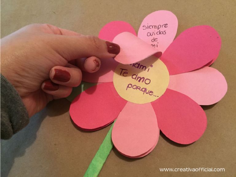 Esta tarjeta es muy fácil de hacer, solo necesitarás cuatro hojas de colores, tijeras, pegamento, plumones y tiempo libre. Como podrás darte cuenta en cada pétalo puedes añadir algún hermoso mensaje para tu madre.