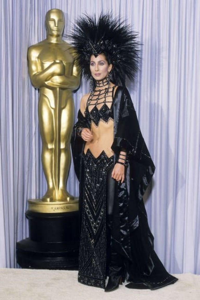 Cher ha destacado por su participación en incontables películas, varias de ellas son musicales, como Mamma Mia!, sin embargo, la noche de los Oscar de 1986, no pudo evitar destacar por su vestido, el cual era sumamente extravagante, tenía una especie de penacho de plumas y era de dos piezas.