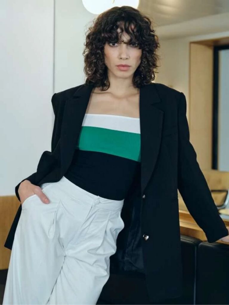 No le tengas miedo a arriesgar y combina este top tricolor con un saco y un pantalón sastre de diferentes colores.
