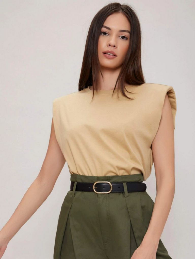 Las camisetas con hombreras son indispensables este año, lo mejor de todo es que no necesitas de muchos complementos para hacerla formal.