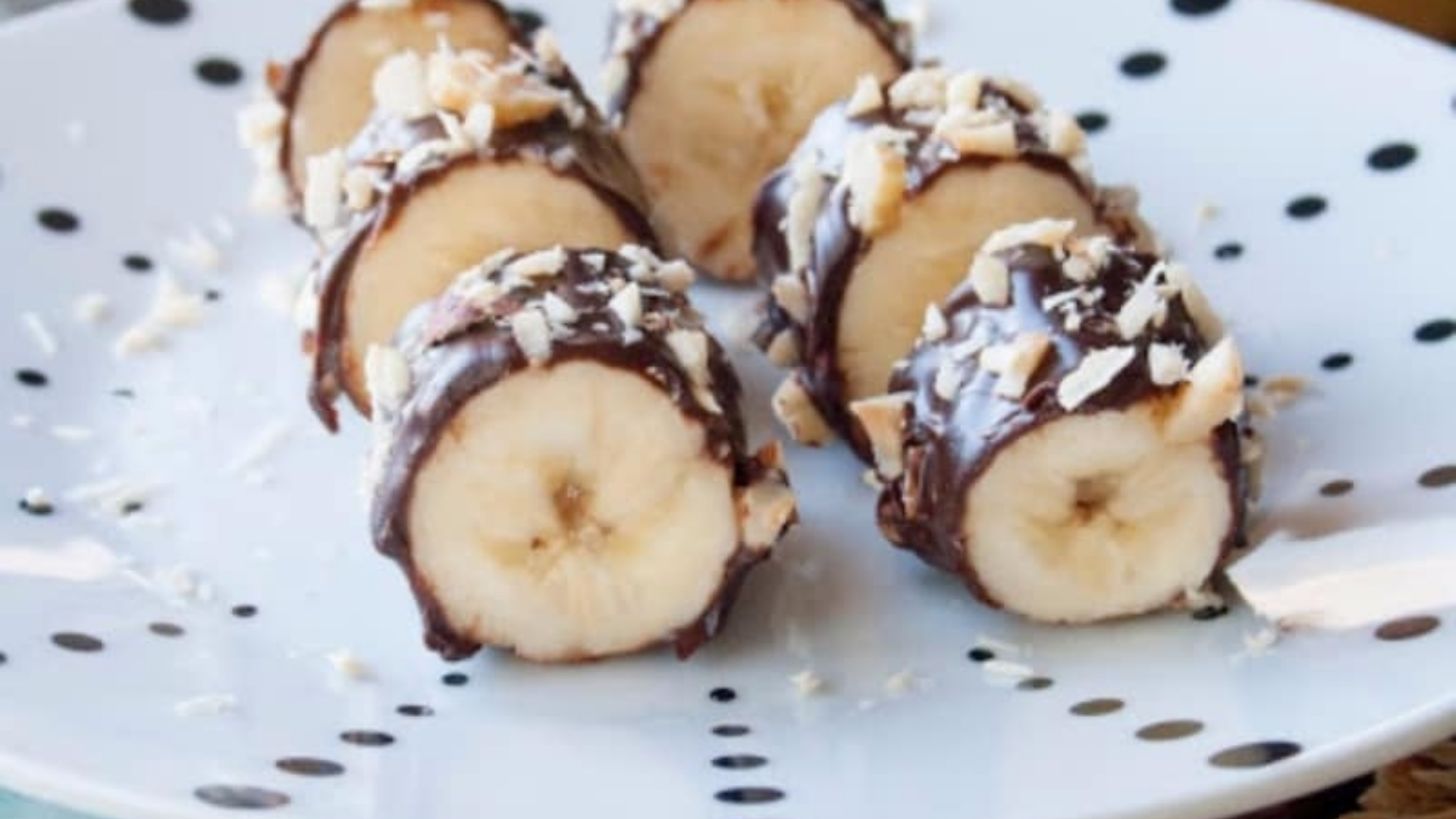3. Corta los plátanos en rodajas y decora con el coco rallado en la cobertura de chocolate.