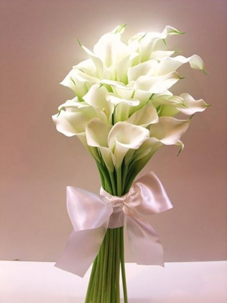 El blanco de los alcatraces podría simbolizar pureza, podrías agregar algunas flores rojas o moradas que ayuden a resaltar ese hermoso blanco, seguramente a tu mamá le encantara esta hermosa alternativa.