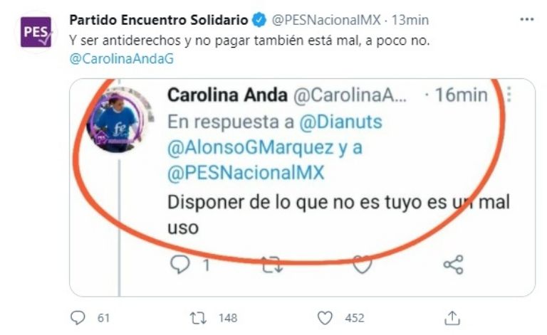 Al ver lo que el equipo de comunicación realizaba con las cuentas del partido, la secretaria de Administración y Finanzas del Partido Encuentro Solidario, reclamó la acción, sin embargo, le respondieron que “ser antiderechos y no pagar” también está mal.