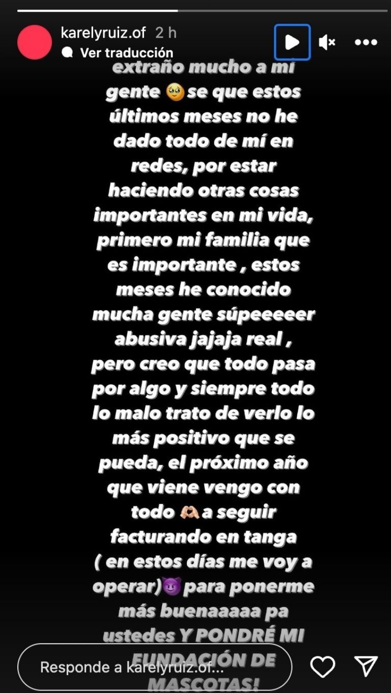 Ciudad de México.- La famosa y polémica influencer, Karely Ruiz reapareció en redes sociales luego de semanas de mucha inactividad en sus cuentas, aunque lo hizo para compartir con sus miles de seguidores que se encuentra cansada de encontrarse con gente abusiva, pues asegura que en los últimos meses no la ha pasado muy bien, pero está dispuesta a seguir triunfando por una buena causa.