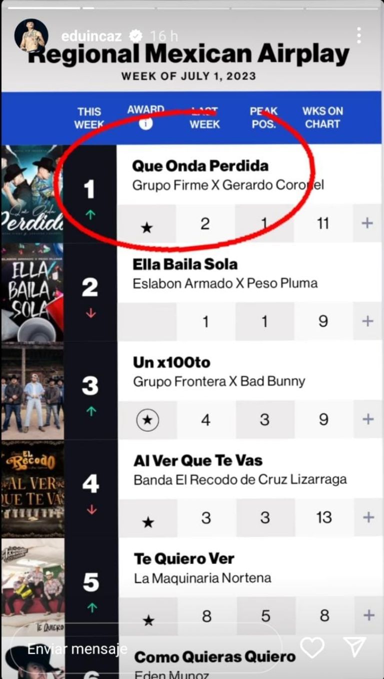En esta ocasión el tema ¿Qué onda perdida?, el cual lanzó en colaboración con Jerry Coronel a finales de marzo los ha llevado a tener el número uno en la lista de los Billboard Latino, la cual es una de las listas más importantes dentro de la música de nuestro continente, en donde compiten artistas de la talla de Enrique Iglesias, Bad Bunny, entre muchos otros más, por tal razón, Eduin Caz se encuentra muy orgulloso de su trabajo.