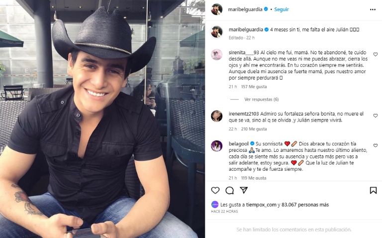 "4 meses sin ti, me falta el aire Julián", fue el breve texto que escribió Maribel Guardia en su publicación, la cual de inmediato generó miles de reacciones de fanáticos que se unieron a la pena que la embarga con mensajes de aliento, aunque también colegas del medio del espectáculo le dejaron muestras de cariño, entre ellos Andrea Legarreta, Consuelo Duval, Ana Bárbara, Latin Lover, Violeta Isfel, Alma cero y Ana Victoria por mencionar algunos.