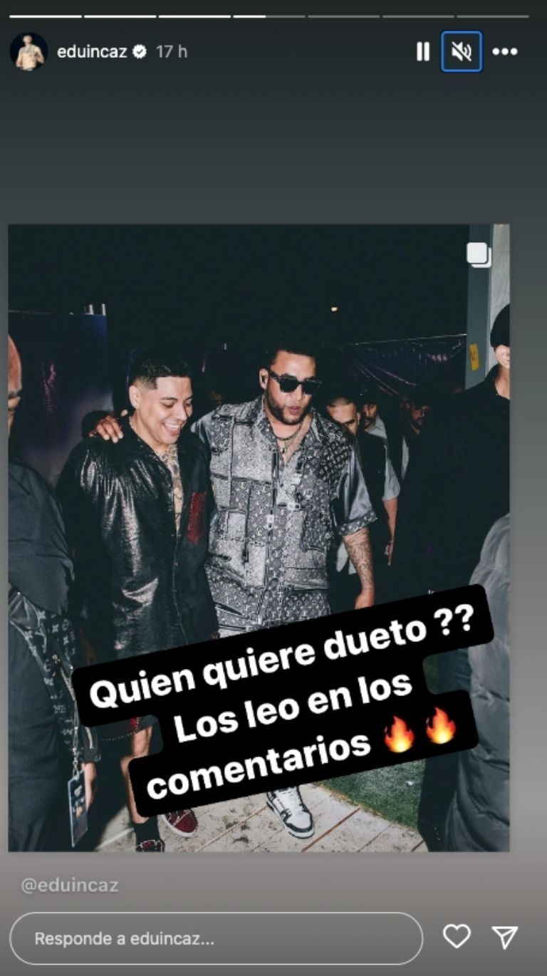 Fue a través de sus redes sociales, donde Eduin mostró algunas fotografías y una de las que más llamó la atención fue donde posó a lado del puertorriqueño, pues en una de sus historias cuestionó directamente a sus fans si es que les gustaría verlos trabajar juntos, lo cual de inmediato causó furor.