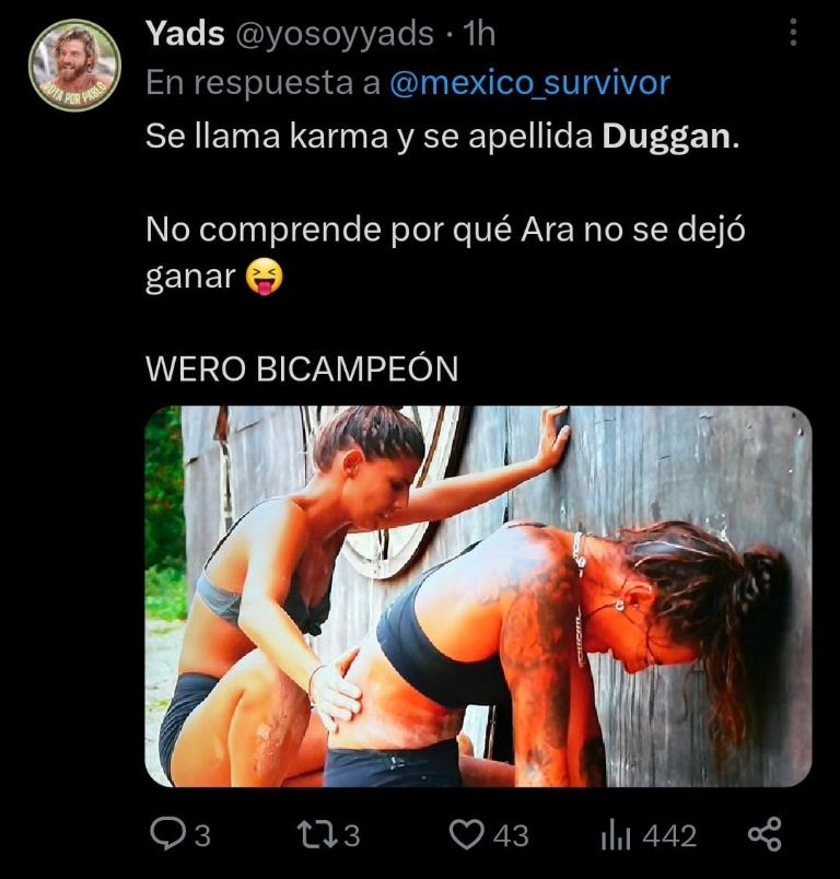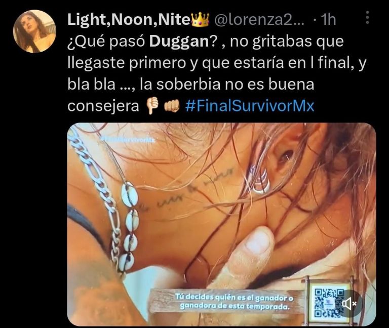 Ciudad de México.- Survivor México cerró la cuarta temporada con una emocionante final, donde los cuatro participantes que llegaron hasta la cumbre tuvieron que enfrentarse por última vez para buscar su lugar en la pelea por los dos millones de pesos, siendo Ximena Duggan la que no logró superar la prueba y se quedó acariciando esa posibilidad que tanto añoraba, mientras las redes sociales se mofaron de ella.