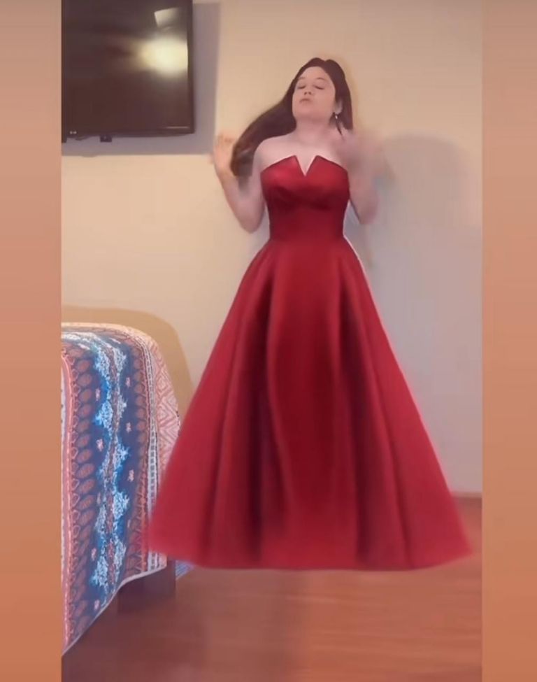 Fiel a su estilo, Karol Sevilla sacó a relucir su buen humor y realizó una parodia en la que se dejó ver con un filtro de un despampanante vestido rojo e hizo bromas acerca de su forma de vestir: "Ya no quiero ser fodonga, por eso me puse mi vestido para ir a dormir", finalizó.
