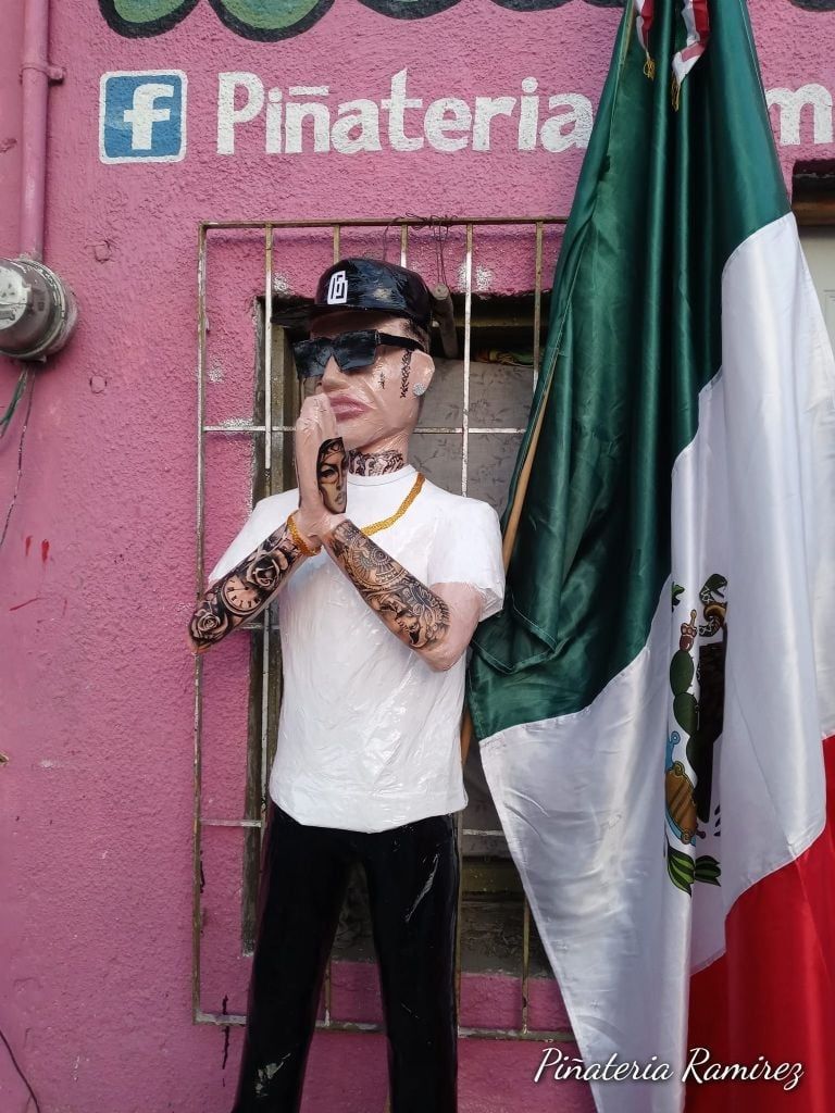 La piñata tiene la clásica postura del rapero, con las palmas en su pecho y una bandera de México, así como sus cadenas de oro, gafas oscuras, gorra, al igual que sus tatuajes, a los cuales le imprimieron muchos detalles, por lo que muchos usuarios reconocieron la similitud que lograron con el famoso cantante.