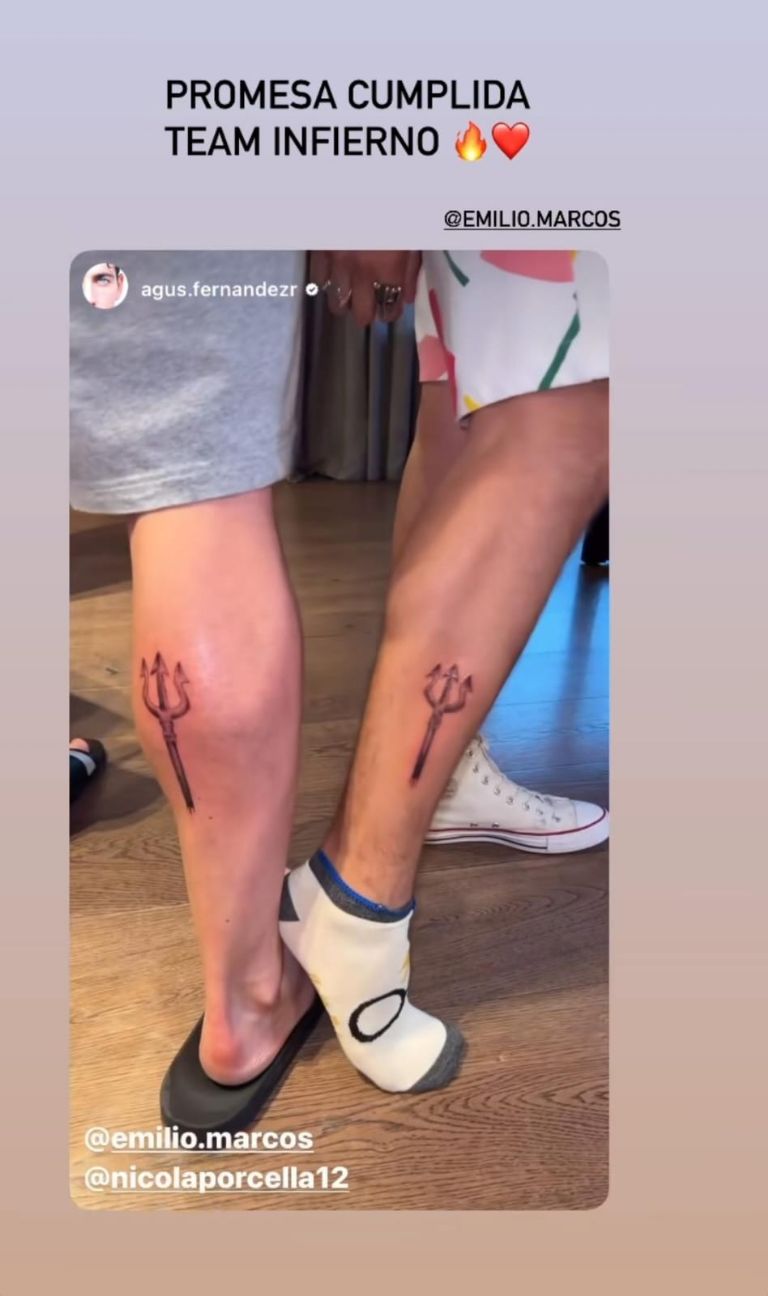 Nicola Porcella fue el primero en probar la aguja y decidió que su tatuaje fuera en la pantorrilla, así que se tumbó en el sillón mientras pensaba en otras cosas, pues confesó en varias ocasiones que le dolía mucho y después siguió el cantante que eligió la misma zona, aunque un poco más en la parte lateral.