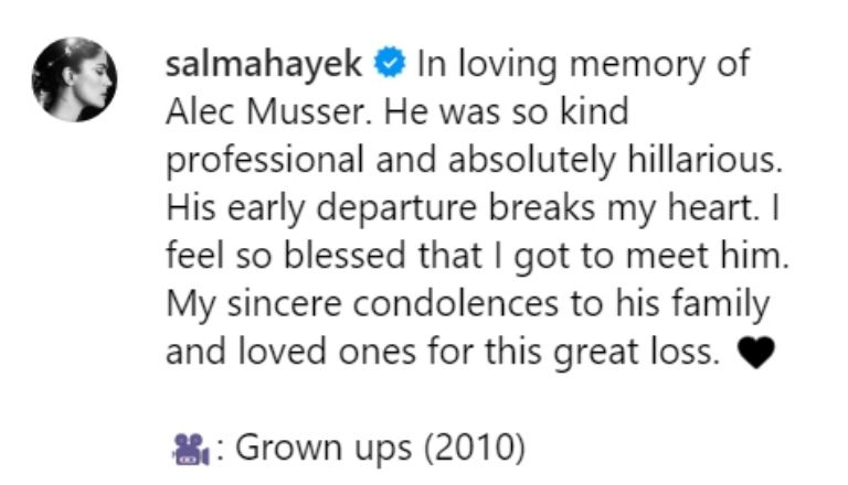En memoria de Alec Musser. Fue muy amable, profesional y absolutamente divertido. Su partida anticipada me rompe el corazón. Me siento tan bendecida de haber podido conocerlo. Mi más sentido pésame a su familia y seres queridos por esta gran pérdida", escribió Salma.