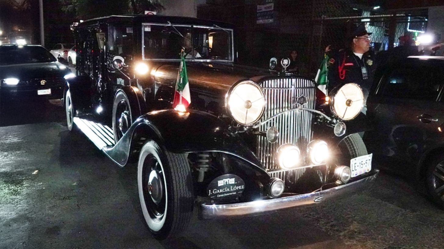 Se trata de una clásica carroza negra, decorada con banderas de México, que rinde homenaje a los grandes íconos del escena nacional. Este vehículo es uno de los 10 modelos originales que existen en el mundo, diseñado por la prestigiosa casa Sayers & Scovill, con sede en Estados Unidos. Está basado en un Cadillac 341A Town Sedan de 1928, equipado con un motor V8 de 5.6 litros y 90 caballos de fuerza. Aunque originalmente tenía capacidad para cinco pasajeros, fue modificado para cumplir con su función como carroza fúnebre.