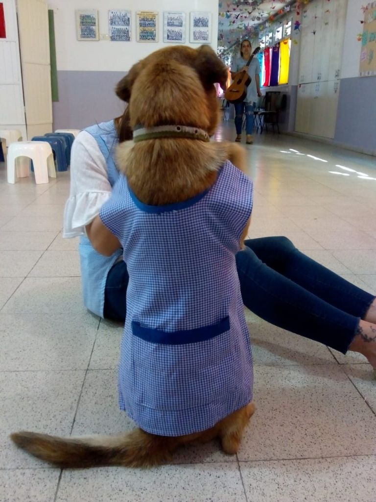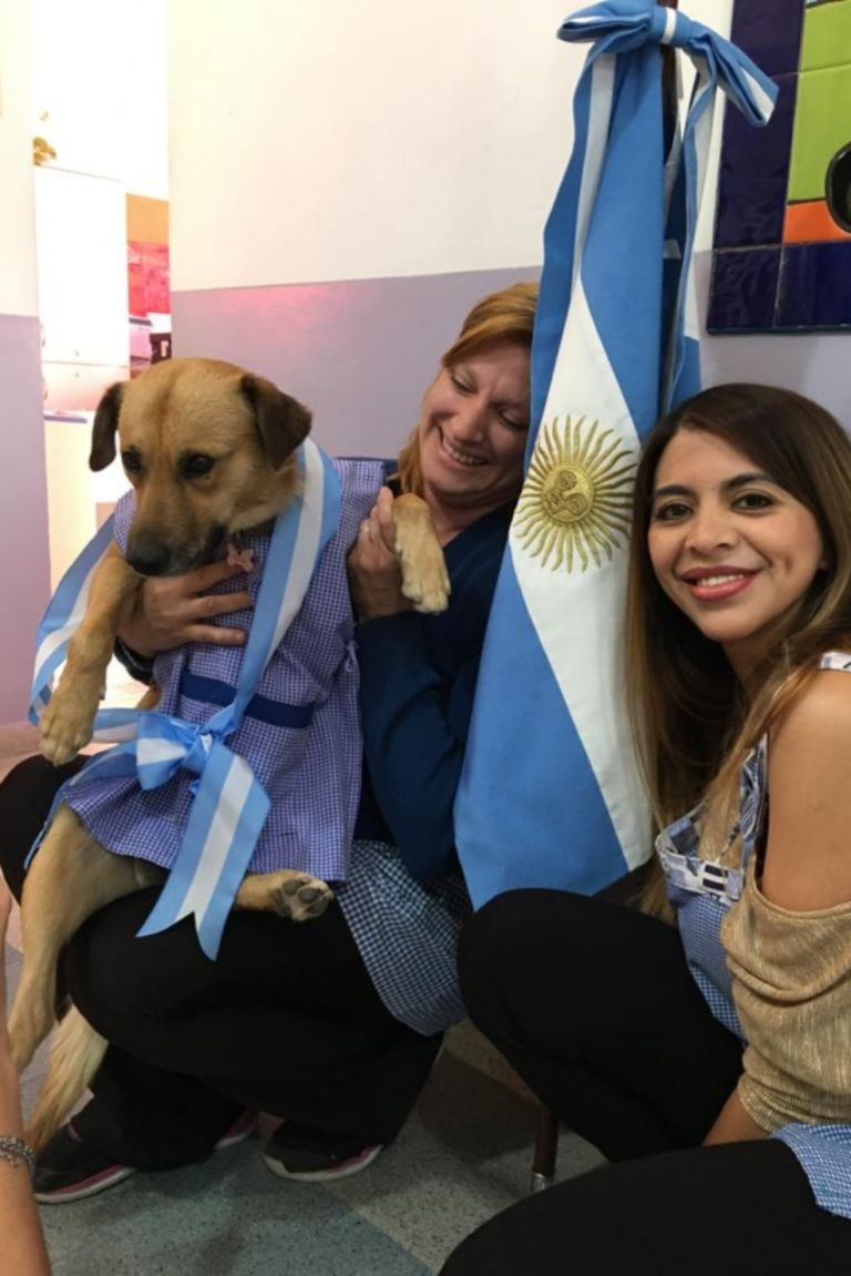 Se trata de un perro en situación de calle que fue adoptado por un jardín niños en Argentina donde recibió el nombre de Fatiga y quien fue fotografiado vistiendo el uniforme escolar y posando junto a la bandera nacional.