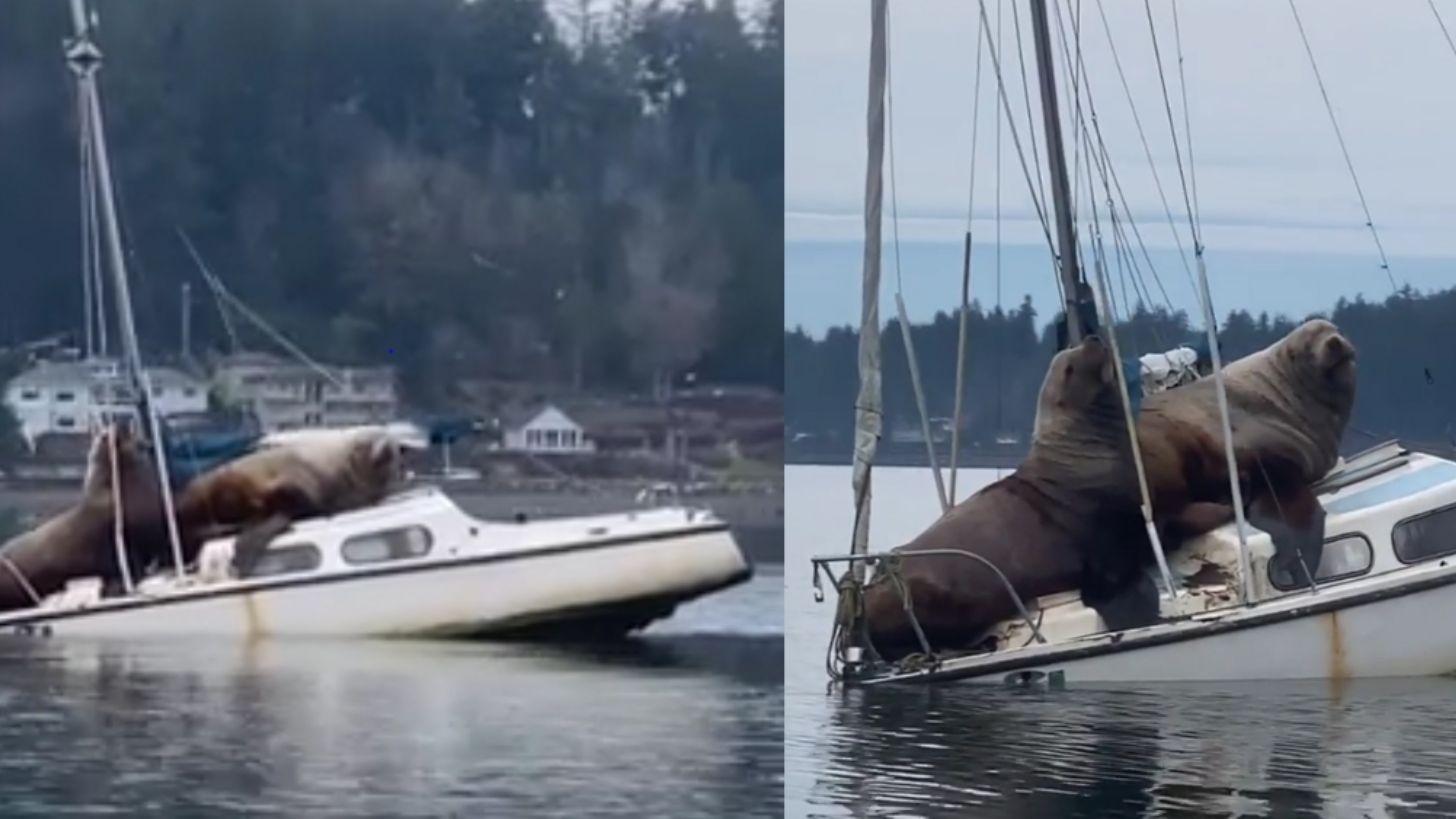 Eld Inlet, Washington.- En redes sociales ha comenzado a viralizarse un divertido video en el que se puede ver a dos grandes lobos marinos sobre una lancha aparentemente abandonada en las aguas de Eld Inlet, causando un gran furor por su audaz 'robo'.