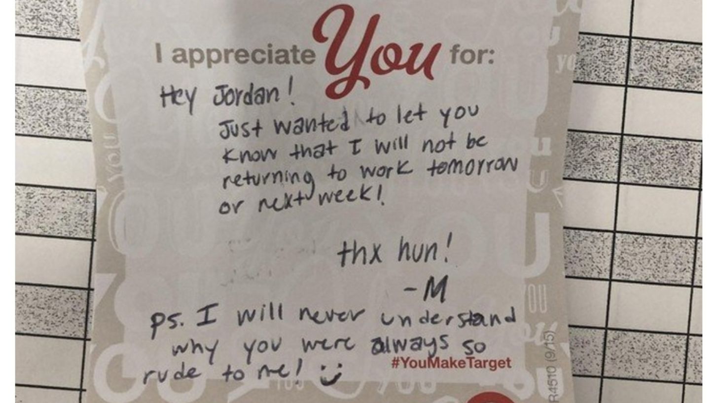 La historia de cómo una mujer renunció a su empleo y por qué se volvió viral trata de una joven mujer aseguró que renunció a su trabajo en Estados Unidos, dejando una explicación muy peculiar. Dejó una nota a su jefa en la que la acusó de ser muy mala con ella. La mujer era empleada de un supermercado de la cadena Target. Contó que decidió renunciar después de su jornada laboral. Su mensaje lo dejó en una nota en el escritorio de su jefa.
