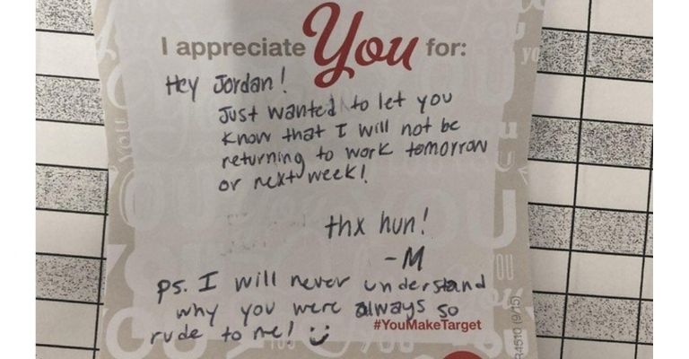 ¡Hey Jordan! ¡Sólo quería hacerte saber que no volveré a trabajar mañana o la semana que viene! ¡Gracias querida! - M. Postdata: nunca entenderé por qué fuiste tan ruda conmigo", escribió la joven en su mensaje de renuncia.