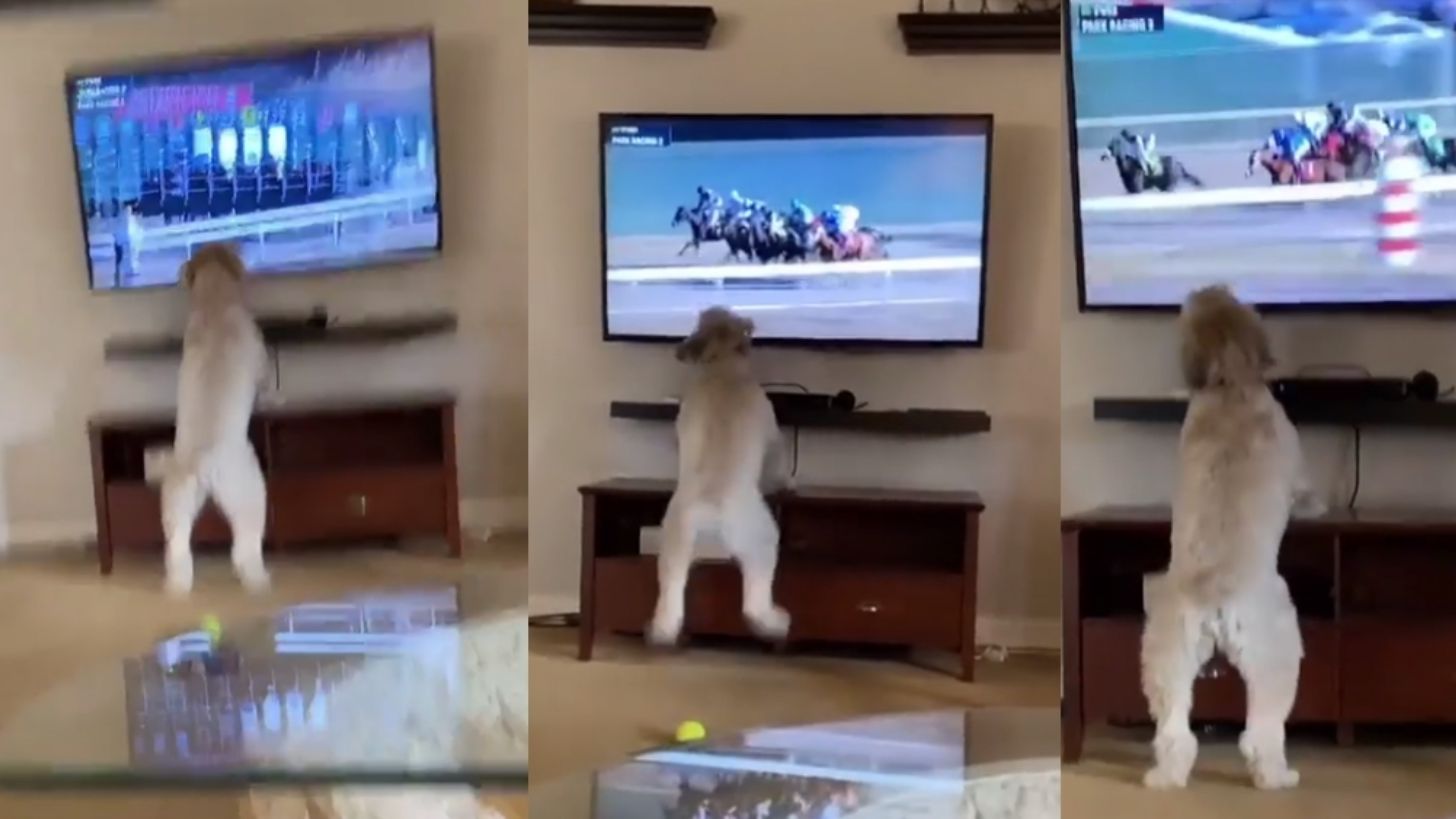 Estados Unidos.- Recientemente ha comenzado a viralizarse en las redes sociales un video en el que se puede ver la reacción de una bella perrita que esta pendiente de televisor para observar las carreras de caballos, conquistando a miles en cuestión de horas.