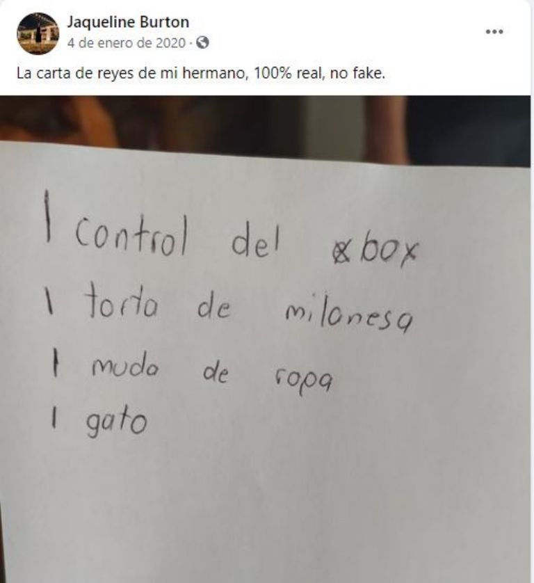 Jaqueline Burton, la hermana fue quien compartió la fotografía de la tierna carta de su hermano donde dejó ver que fue del puño y letra del niño con sus cuatro peticiones, por lo que agregó en la descripción, "la carta de reyes de mi hermano, 100% real, no fake".