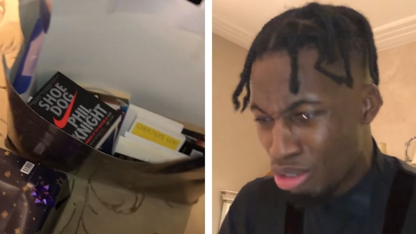 Desafortunadamente para él, las cosas no son lo que parecen. Cuando volvió para desenvolver lo que cree que es una consola de videojuegos, pronto se da cuenta que en realidad era una pila de libros que logró cambiar la expresión de su rostro radicalmente.