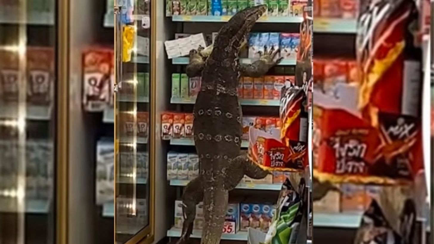 Bangkok, India.- Un lagarto gigante fue captado en una tienda 7-Eleven subiendo a un estante y tirando todo a su paso. El extraño suceso se compartió en redes sociales donde, en cuestión de horas, se viralizó.