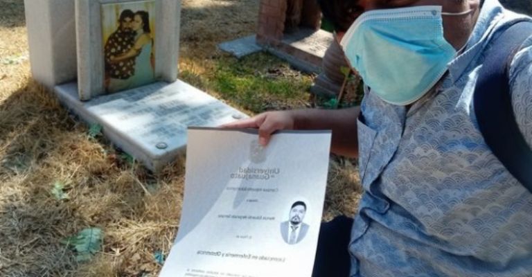 Guanajuato.- Un joven se volvió viral en Facebook luego de compartir una emotiva fotografía en la que documentó su visita al cementerio. Lo que llamó la atención fue que con él llevaba su título universitario para mostrárselo a sus difuntos padres.
