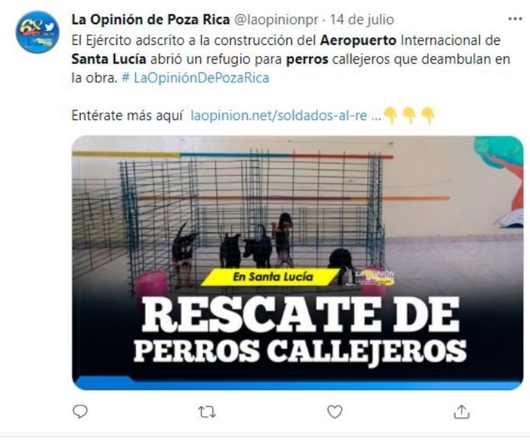 La idea surgió durante la construcción del aeropuerto de Santa Lucía, en Zumpango, Estado de México, cuando se percataron de que una gran cantidad de perros deambulaba por el lugar, así que decidieron darles refugio. De acuerdo con algunos informes, Perritos de Santa Lucía albergaría hasta 50 perros, lugar en el que recibirán alimento y refugio.