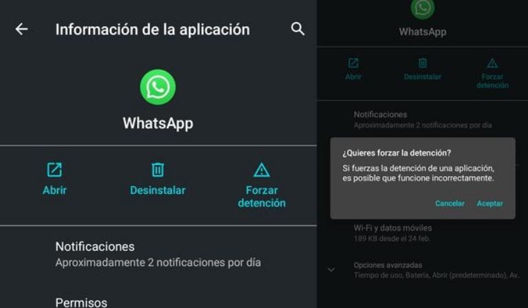 Al momento de entrar al apartado de la app, aparecerá el botón para Forzar Cierre, mismo que al dar clic se apagará el servicio de mensajería instantánea y se volverá a encender justo cuando se decida abrir de nuevo la aplicación para que aparezcan los mensajes y notificaciones que se pausaron.