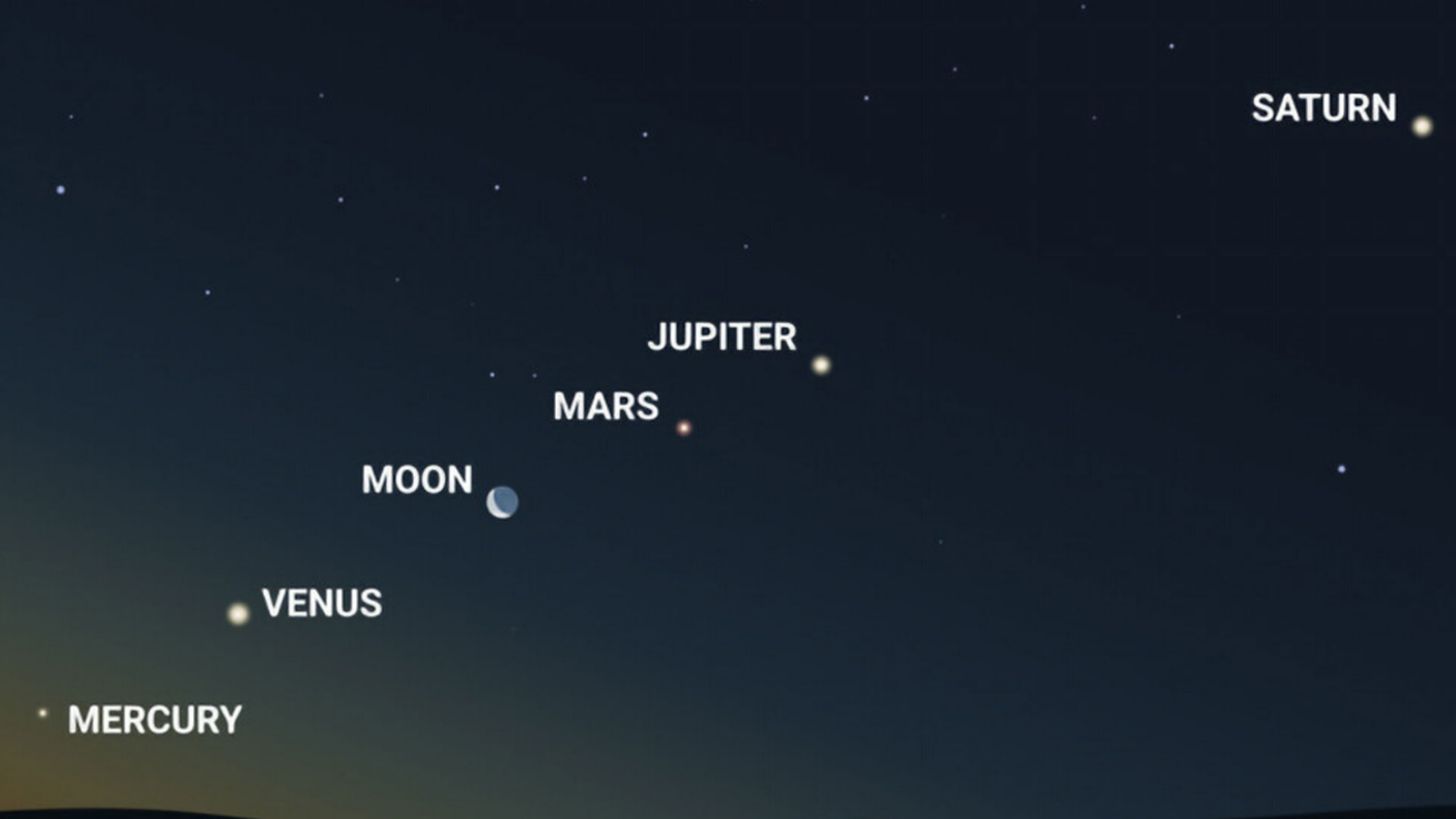Este tiempo, Mercurio, Venus, Marte, Júpiter y Saturno han estado alineados de izquierda a derecha en el cielo, pero este día 24 fue especial debido a que la Luna se puso entre el segundo y el tercero, tomando el espacio que tiene la Tierra. Sky&Telescope precisó que el primero salió alrededor de una hora antes del Sol, por lo que fue posible ver el espectáculo completo antes de que las condiciones brillantes dificultaran la observación.