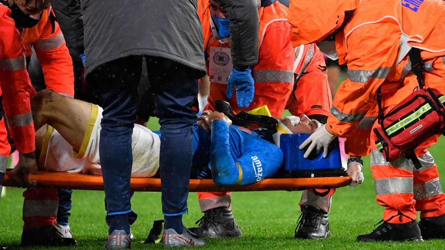 El mexicano se impactó fuertemente con Wilfred Ndidi en la cara, incidente que lo obligó a salir del campo en camilla y con collarín.