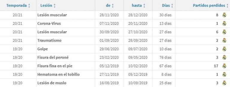 Con la playera del Real Madrid, el belga Eden Hazard ha acumulado al menos 9 lesiones, que lo han privado de jugar en al menos 43 partidos, y la más reciente lo privará de al menos 6 encuentros más.