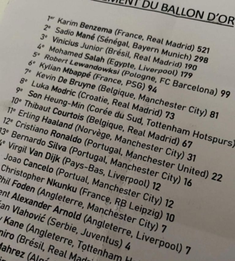 Ciudad de México.- A unos días de que se celebre la ceremonia de entrega del Balón de Oro 2022, en redes sociales circuló una presunta lista en la que se observan lo que serían las posiciones finales en la carrera para llevarse el premio, mismo que se llevaría por primera vez el futbolista del Real Madrid, Karim Benzema, con una puntuación de 521 puntos.