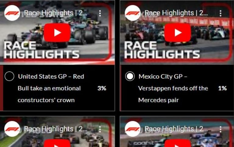 El sitio pone a disposición de los aficionados todas las opciones para votar acompañados de sus highlights para que puedas recordar los mejores momentos si no estás seguro de cual seleccionar. Una vez emitido tu voto se muestran los porcentajes en tiempo real de la votación. Al cierre de esta edición, El GP de México tenía el uno por ciento de los votantes. Mientras que la más votada era la del GP de Gran Bretaña con el 34 por ciento. Puedes votar por tu carrera favorita aquí.