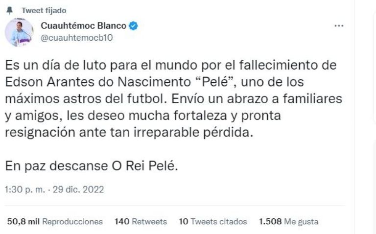 El exfutbolista mexicano Cuauhtémoc Blanco también mandó un mensaje en su cuenta de Twitter en donde lamentó la pérdida: "Es un día de luto para el mundo por el fallecimiento de Edson Arantes do Nascimento 'Pelé', uno de los máximos astros del fútbol. Envío un abrazo a familiares y amigos, les deseo mucha fortaleza y pronta resignación ante tan irreparable pérdida. En paz descanse O Rei Pelé", escribió el ahora alcalde de Morelos.