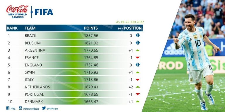Otro movimiento destacado en el listado fue el ingreso de Argentina, rival de México en la Copa del Mundo, al Top 3 con mil 770.65 unidades, dejando fuera del podio al vigente campeón mundial Francia, quien tuvo complicaciones en sus últimas presentaciones y bajó al cuarto lugar con mil 764.85 puntos. La 'verde-amarela' cuenta con mil 837.56, al frente del ranking FIFA, mientras que Bélgica, en el segundo puesto, tiene mil 821.92 unidades.