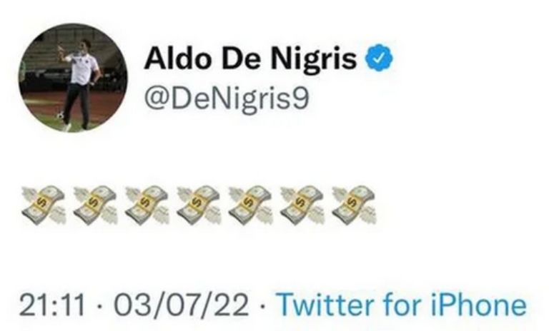 Sin embargo, esta semana el exfutbolista de 38 años y su hermano, el actor y conductor Alfonso de Nigris, dieron bastante de qué hablar luego de que el primero hiciera algunos comentarios en redes sociales con respecto al arbitraje del partido anterior de los regios, en el cual perdieron ante Santos Laguna, lo cual le valió una sanción de un partido por parte de la Liga MX. Aldo de Nigris tuiteó varios emojis de unos billetes con alas, criticando el arbitraje que consideró les jugó en contra; no obstante, el auxiliar técnico borró la publicación momentos después, no sin que la Comisión Disciplinaria lo castigara.