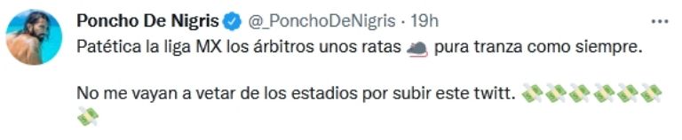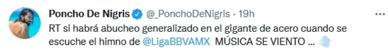 Esta situación molestó a Poncho de Nigris, quien por la misma vía arremetió contra la Liga por la sanción hacia su hermano menor: "Qué es esto ??? Por un twitt. Vaya lacras que tenemos en el fútbol. Siempre ha sido lo mismo desde el pacto de caballeros que no dejaron jugar a Toño (su difunto hermano) en Mexico porque se había ido sin pagar derecho de piso. Viva México", dijo. Asimismo, invitó a la afición de la Pandilla abuchear el himno de la Liga MX en el Gigante de Acero para el próximo partido del club, que sería ante el América.