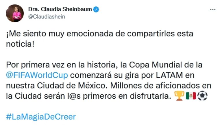 ¡Me siento muy emocionada de compartirles esta noticia! Por primera vez en la historia, la Copa Mundial de la FIFA comenzará su gira por LATAM en nuestra Ciudad de México", manifestó la funcionaria, quien agregó que será en octubre cuando el famoso trofeo visite la ciudad y que pronto se darán más detalles para que los aficionados puedan acudir a observarla.