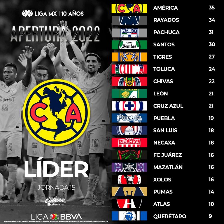 Al término de la Jornada 15 del torneo, y con todos los equipos que ya jugaron anteriormente la Jornada 16, América, Monterrey y Pachuca son quienes tienen asegurado su boleto a los Cuartos de Final. El cuarto lugar lo pelean Santos y Tigres, con 30 y 27 puntos, respectivamente.