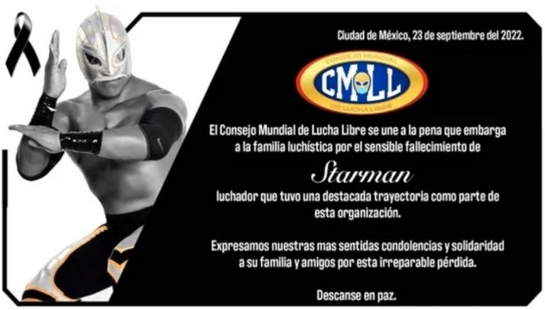El CMLL se une a la pena que embarga a la familia luchística por el sensible fallecimiento de Starman, luchador que tuvo una destacada trayectoria como parte de esta organización. Descanse en paz", dice el mensaje a través de Twitter.