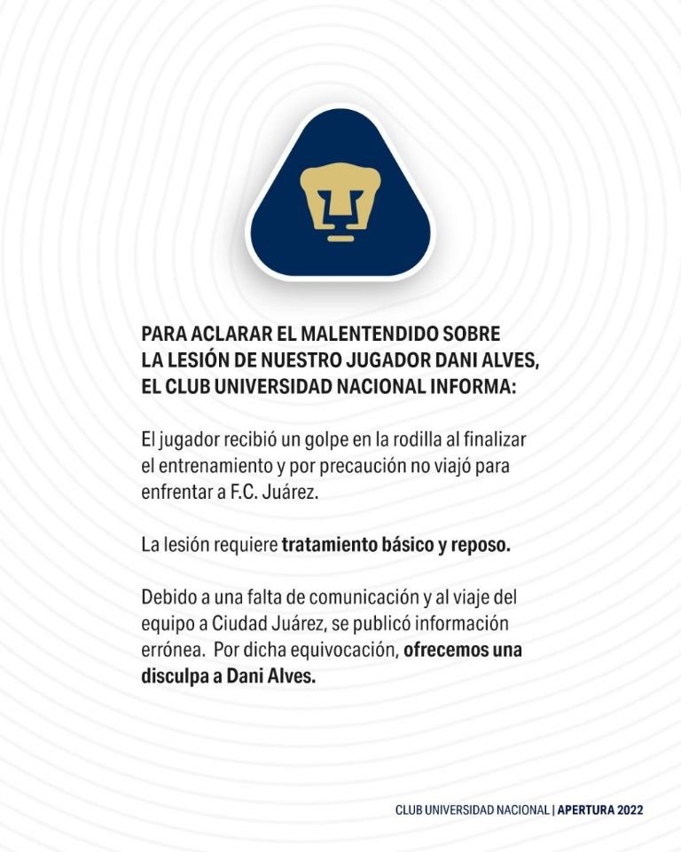 Para aclarar el malentendido sobre la lesión de nuestro jugador Dani Alves, el Club Universidad Nacional informa: El jugador recibió un golpe en la rodilla al finalizar el entrenamiento y por precaución no viajó para enfrentar a FC Juárez. La lesión requiere tratamiento básico y reposo", precisó el equipo en el nuevo comunicado.