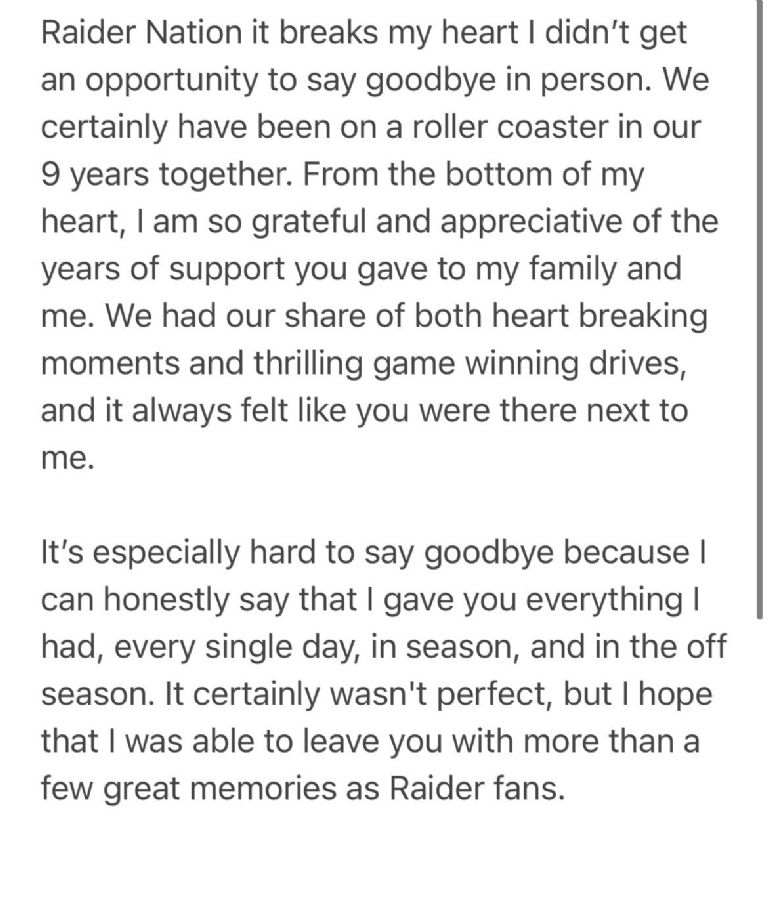 “Raider Nation, me rompe el corazón, no tuve la oportunidad de despedirme en persona. Ciertamente hemos estado en una montaña rusa en nuestros nueve años juntos. Desde el fondo de mi corazón, estoy muy agradecido y agradecido por los años de apoyo que nos diste a mi familia y a mí. Tuvimos nuestra parte de momentos desgarradores y emocionantes campañas ganadoras, y siempre se sintió como si estuvieras allí a mi lado”, escribió.