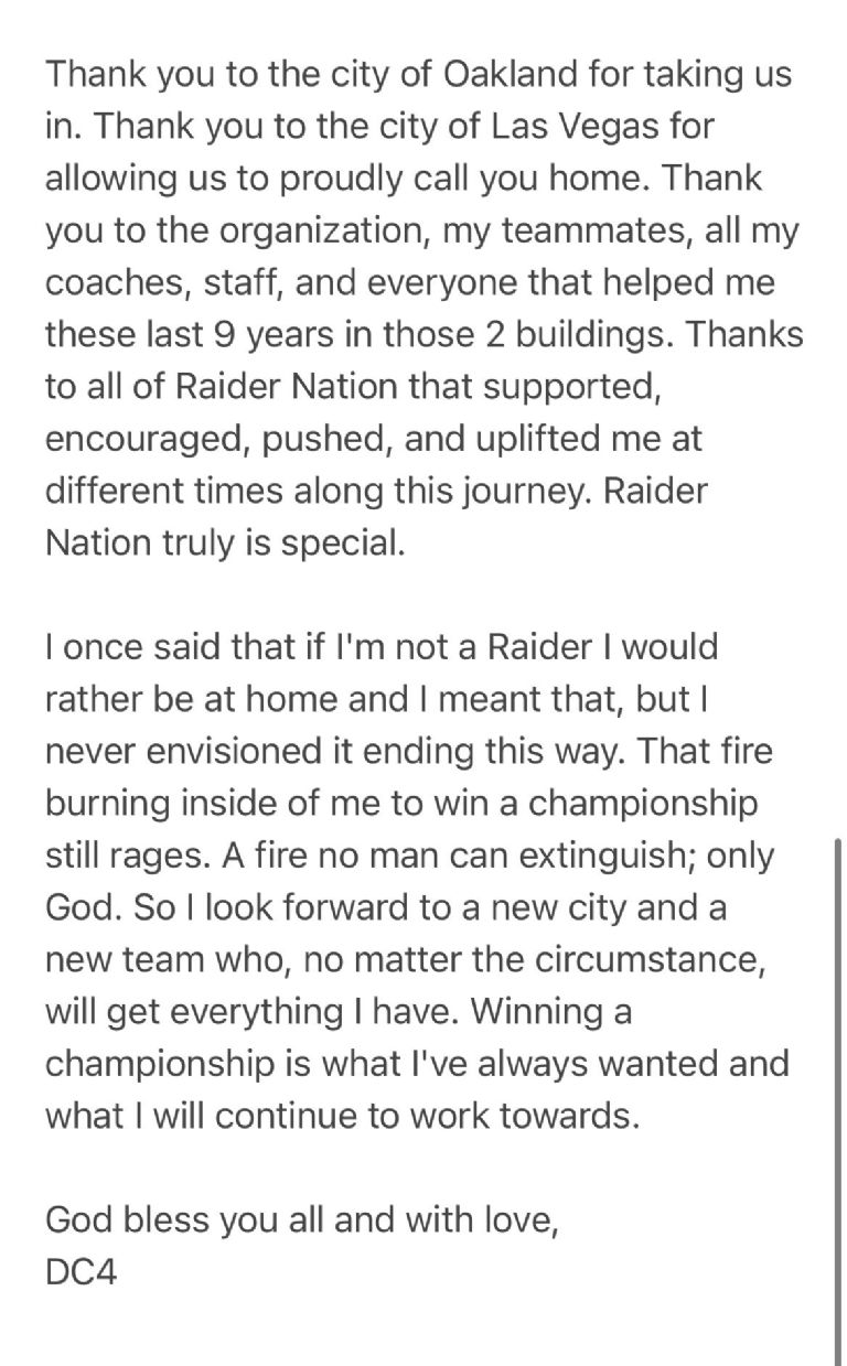 "Gracias a la ciudad de Oakland por recibirnos. Gracias a la ciudad de Las Vegas por permitirnos llamarte con orgullo: casa. Gracias a la organización, a mis compañeros de equipo, a todos mis entrenadores, personal y a todos los que me ayudaron estos últimos 9 años. Gracias a todos los Raider Nation que me apoyaron, alentaron, empujaron y elevaron en diferentes momentos a lo largo de este viaje. Raider Nation es realmente especial”, expresó el jugador que todavía no dio pistas sobre su futuro.