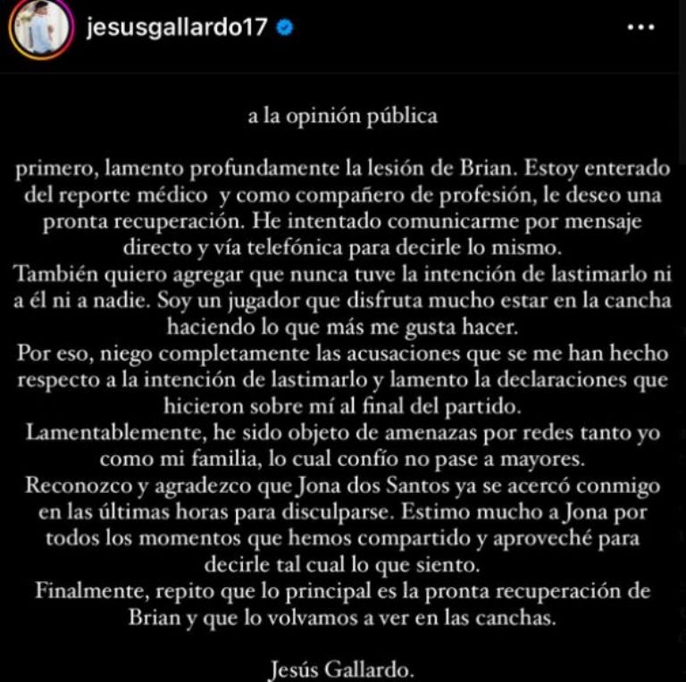"Lamentablemente, he sido objeto de amenazas por redes tanto yo como mi familia, lo cual confío no pase a mayores", escribió el jugador en sus redes. El tema se volvió tan polémico que Monterrey tuvo que salir también a defender a su futbolista a través de un comunicado en donde niega las acusaciones. “Es totalmente falso que Jesús Gallardo haya amenazado con lesionar intencionalmente a Brian Rodríguez.